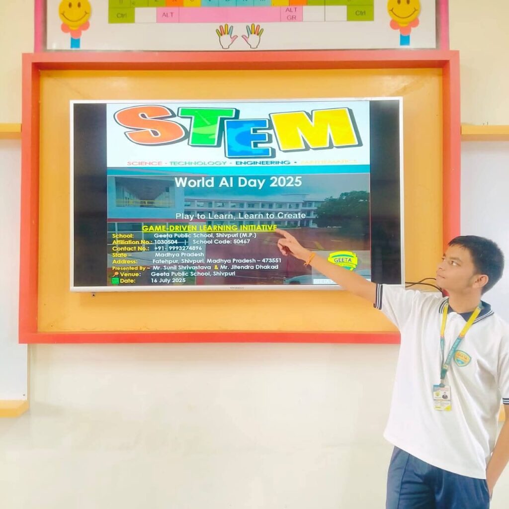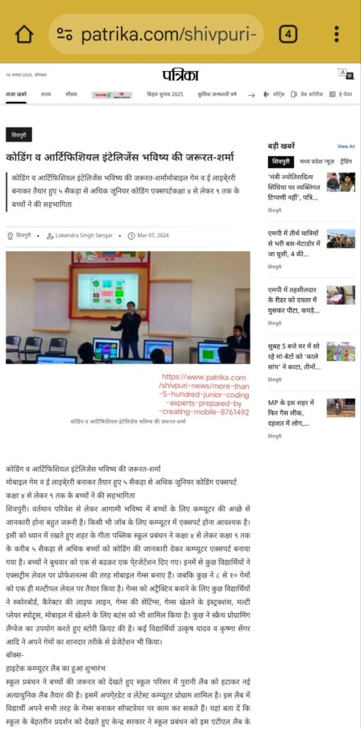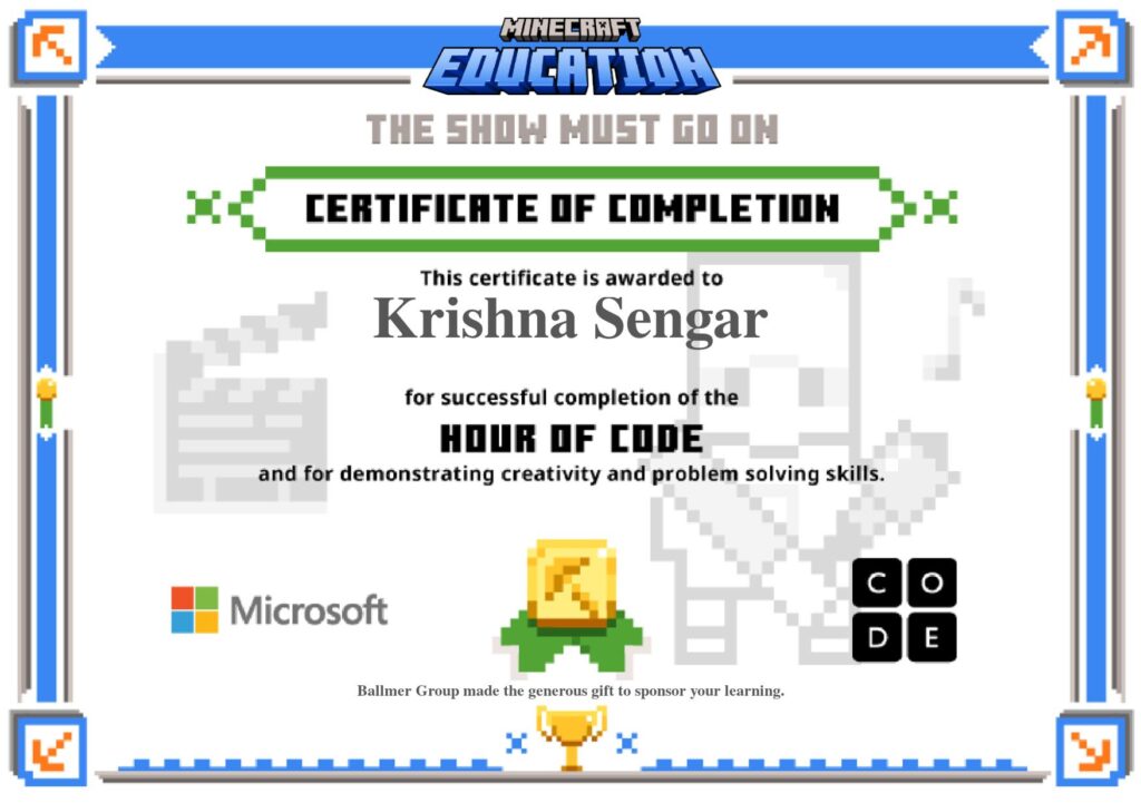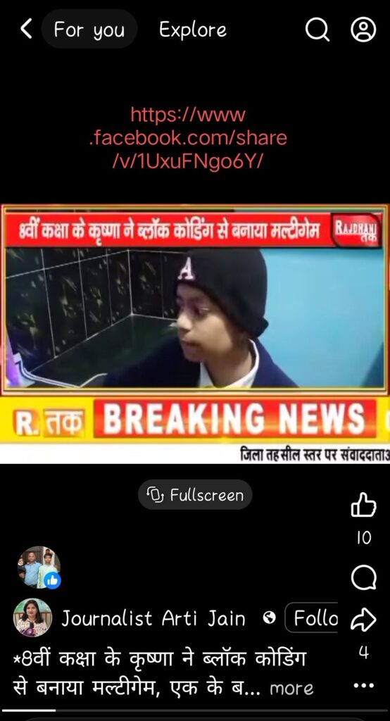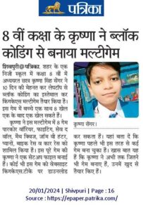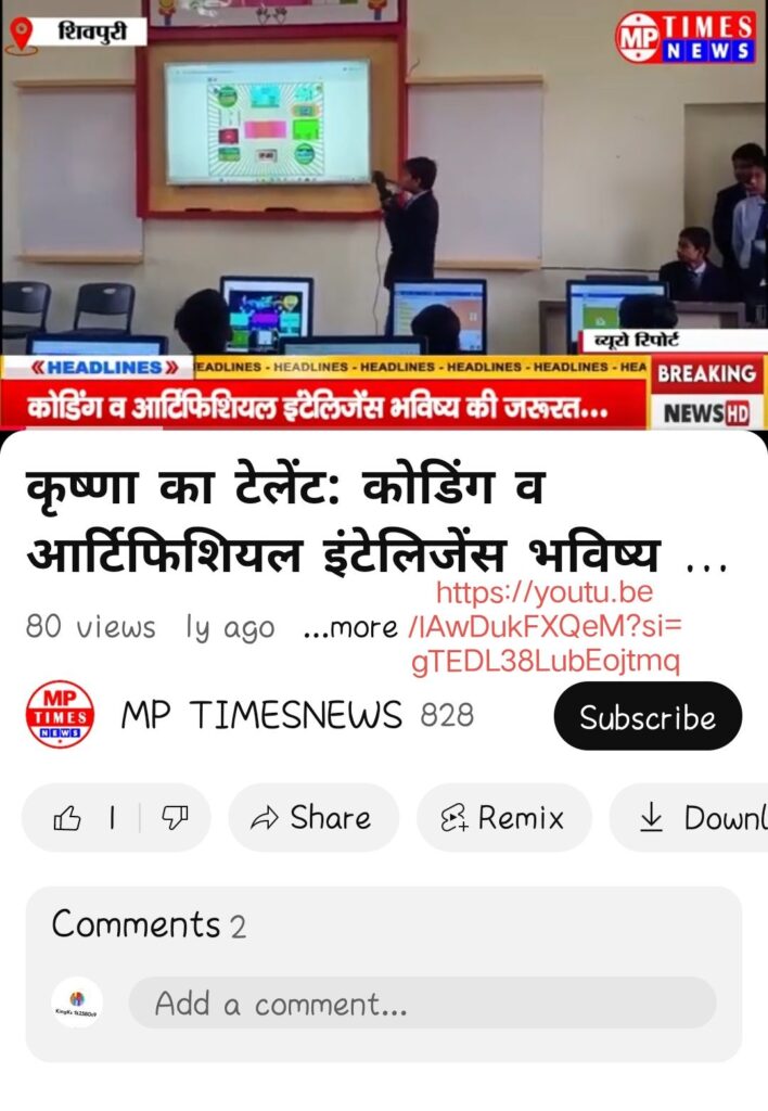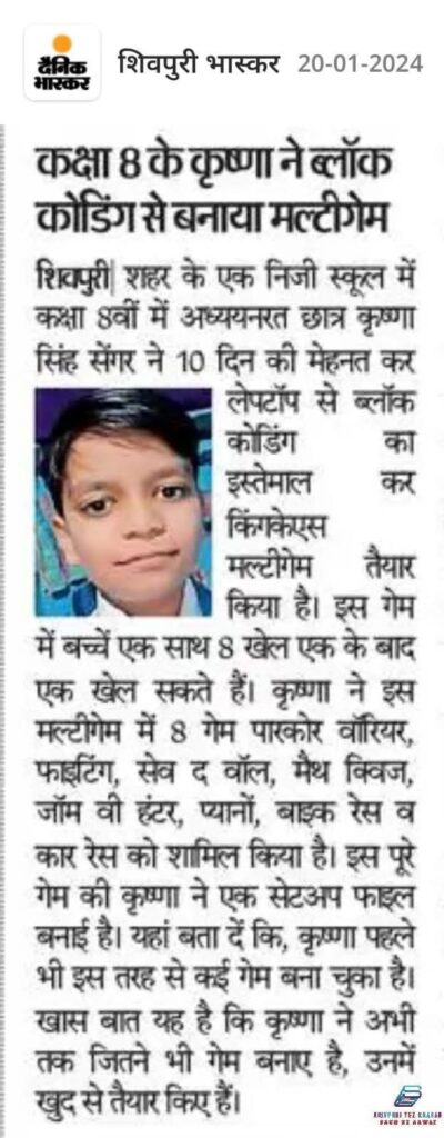 In Class 8, Krishna’s computer skills were noticed by his teacher, Mr. Sunil Shrivastava, who encouraged him to overcome his fear of public speaking. Krishna was given opportunities to present and even teach his classmates. Within a short span, he became confident and successfully trained over 200 students in Scratch block coding.